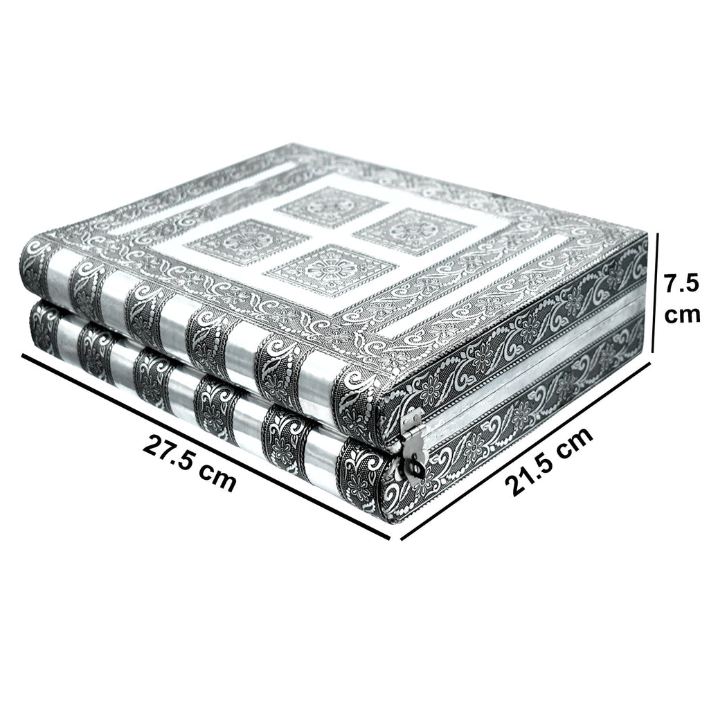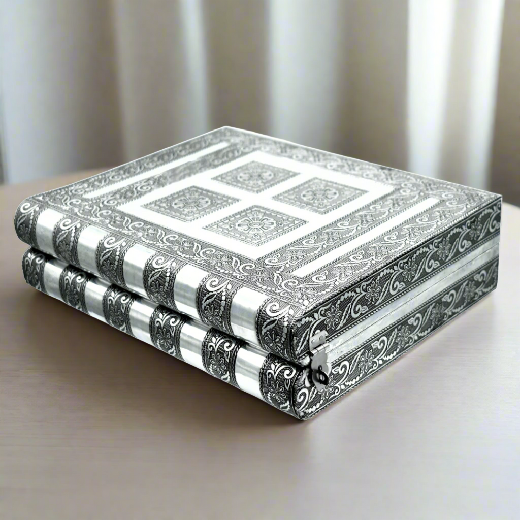 Oxidised Jewellery Box minakari Box. you can use it as a jewelry box. Jewellery boxes are beautiful receptacles for your jewels and trinkets. This jewellery box is made of wood covered with high quality metal foil having good quality velvet inside. It has 5 boxes for earrings n chains and 1 row for bangles. attractive & useful look for lock. Jewellery box helps you develop the habit of taking care of your jewellery properly. This individually engraved box is in fact often collected as decorative box. Using a jewellery box helps - keep jewellery safe so it cannot be lost or inadvertently damaged, keep jewellery in one location so pieces of sets are not separated, keep jewellery clean by keeping it away from daily dust, dirt, and grime. It can be a precious gift item too. This oxidized finish box is ideal for gift at weddings.