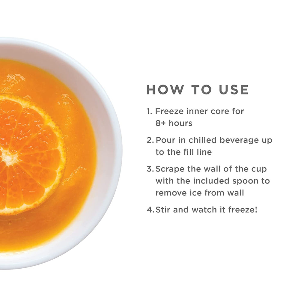 - EASY TO USE: Freeze the inner core for 8+ hours, remove from freezer and place it in to the outer cup, pour in your ingredients, mix and scrape the cup with the included spoon, watch as the slush freezes before your eyes; hand wash with warm water.